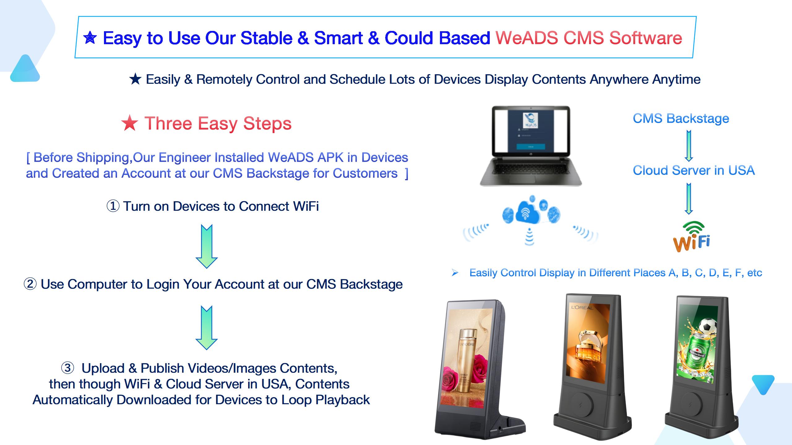 【Cloud Based CMS Software & Easy to Upload Contents】Remotely Control Display through CMS Backstage & WiFi Connection & Cloud Server